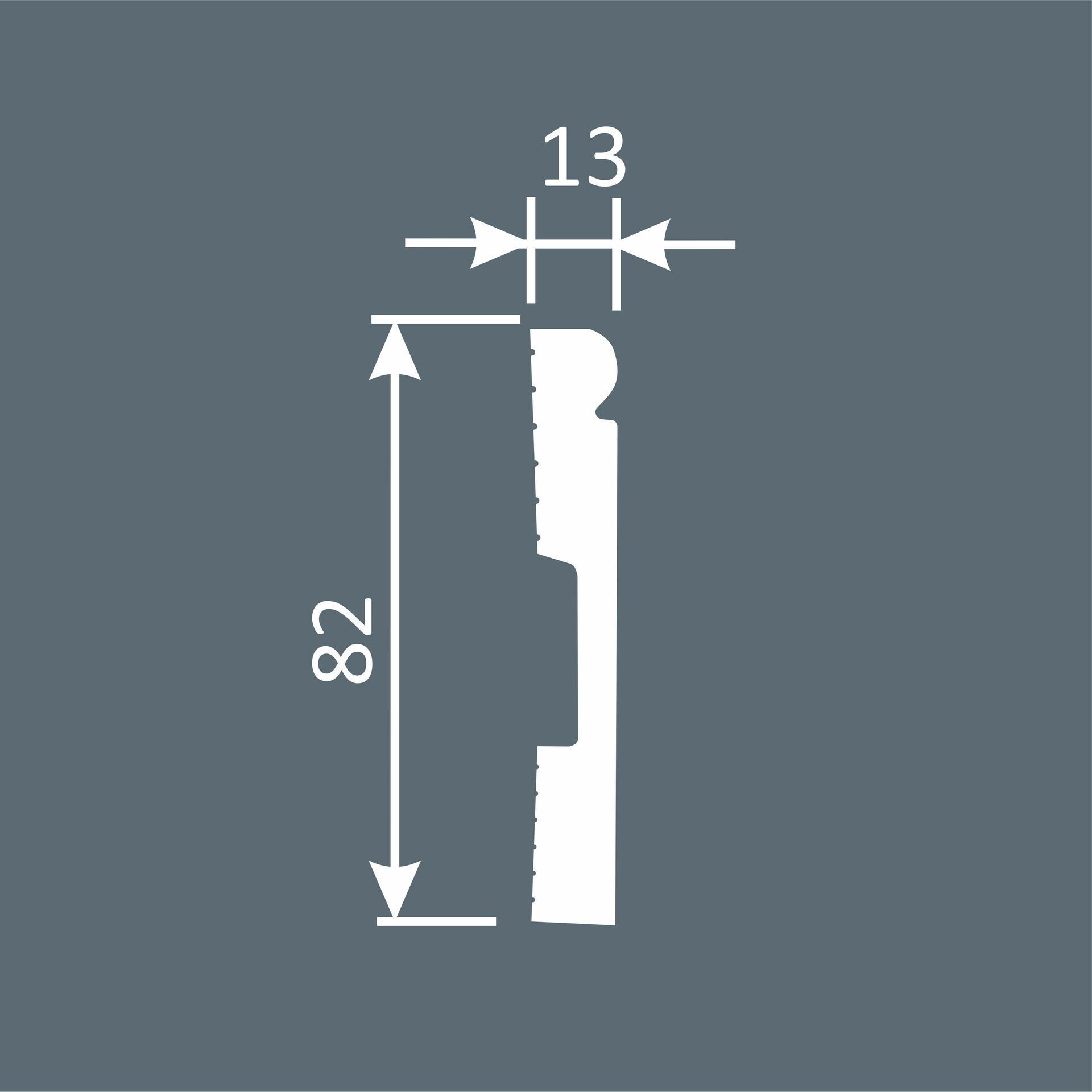 Размеры и цвет: плинтус имеет высоту 82 мм, ширину 13 мм и длину 2000 мм, что позволяет использовать его для различных типов напольных покрытий. Цвет плинтуса - белый, что позволяет ему гармонично вписываться в любой интерьер.