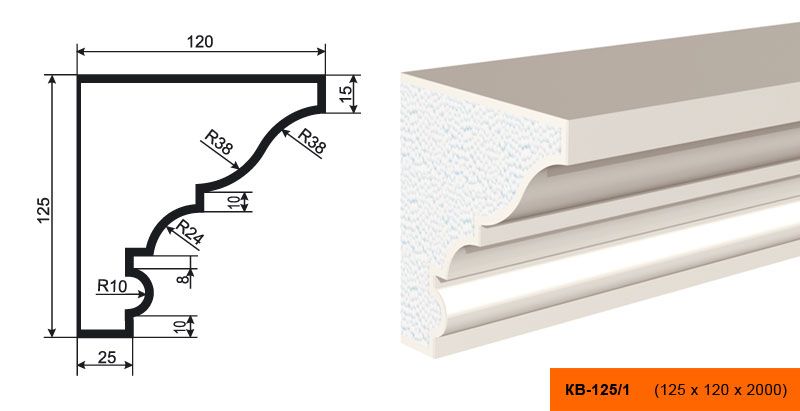 Lepninaplast КВ-125/1 - это фасадный карниз, выполненный из пенополистирола ПСБ-С-35. Этот материал отличается высокой прочностью и долговечностью, что гарантирует долгий срок службы изделия.