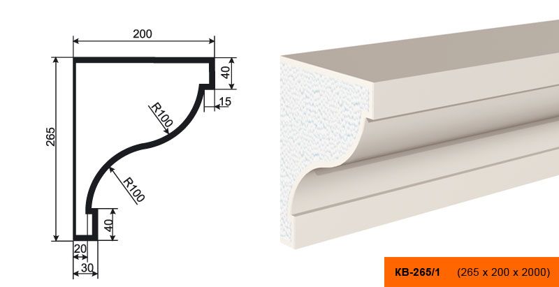 Lepninaplast КВ-265/1 - это фасадный карниз, выполненный из пенополистирола ПСБ-С-35. Этот материал отличается высокой прочностью и долговечностью, что гарантирует долгий срок службы изделия.
