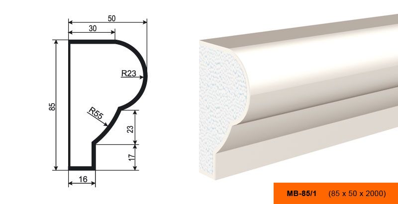 Молдинг имеет размеры 8.5 см в высоту, 5 см в ширину и 200 см в длину. Благодаря своим компактным размерам, он легко впишется в любой интерьер и не займет много места.