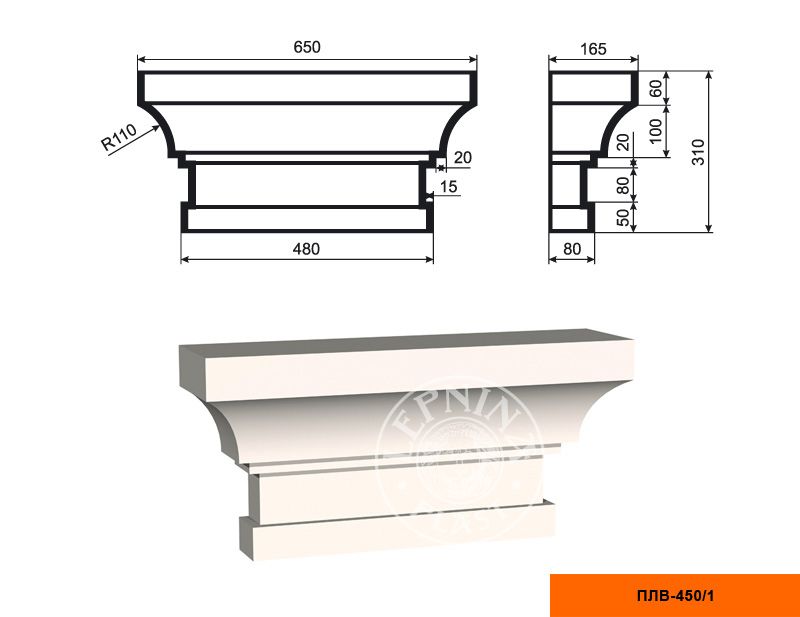 Капитель к фасадной пилястре из пенополистирола с покрытием LEPNINAPLAST-FASAD (Лепнинапласт-фасад) ПЛВ-450/1 - это высококачественный элемент декора, который придаст вашему дому или офису неповторимый стиль и изысканность.