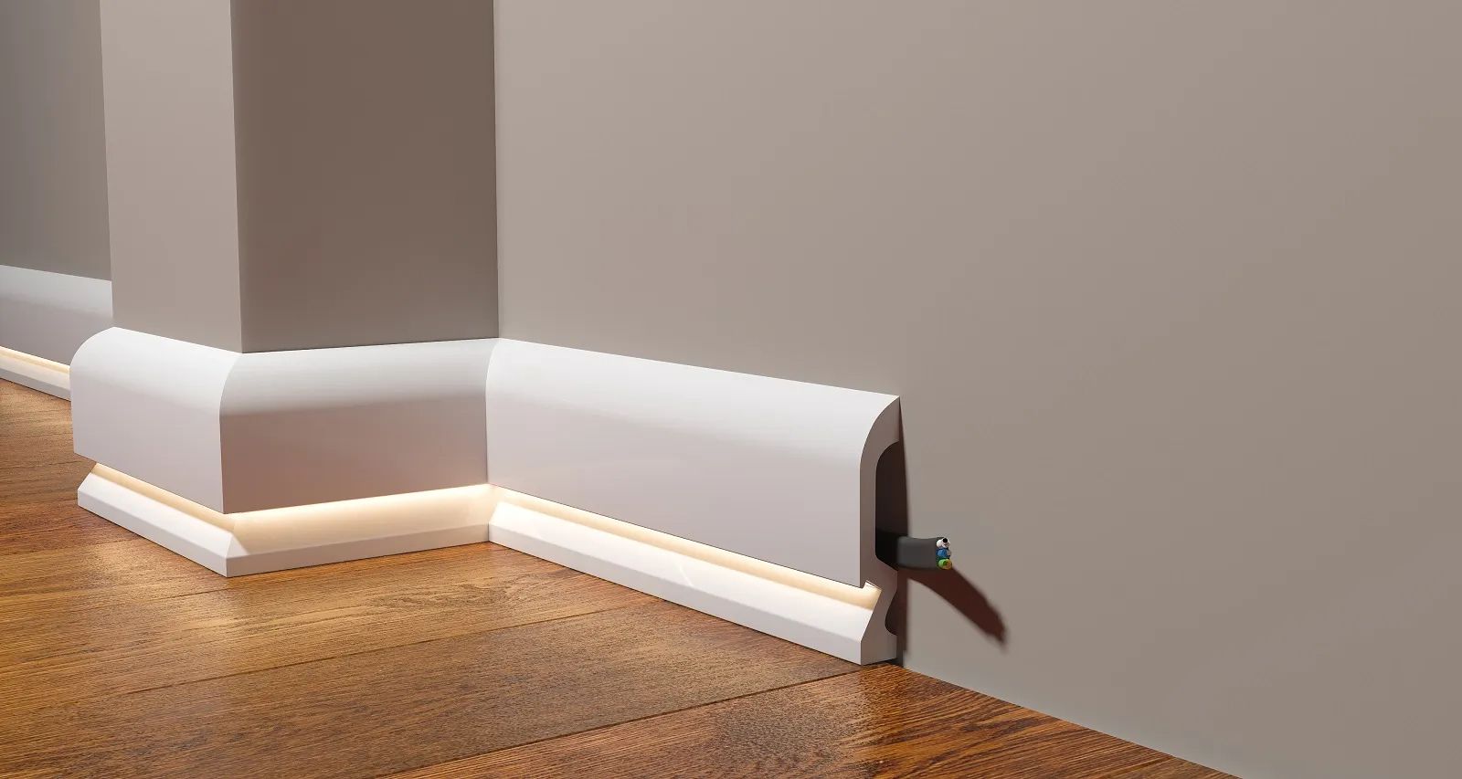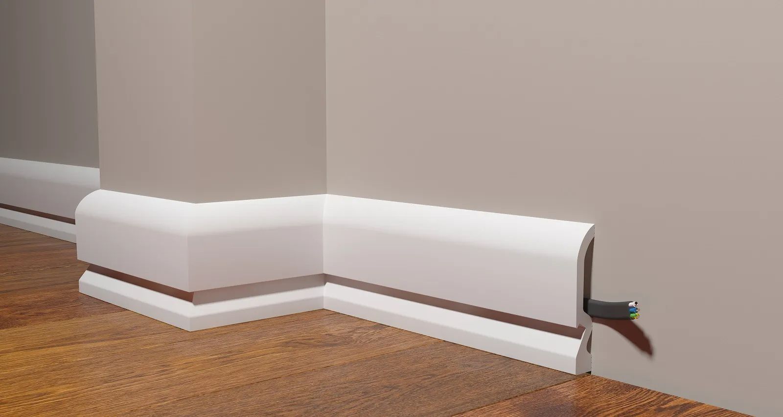 Плинтус оснащен кабель-каналом, что позволяет удобно и безопасно проводить провода и кабели.