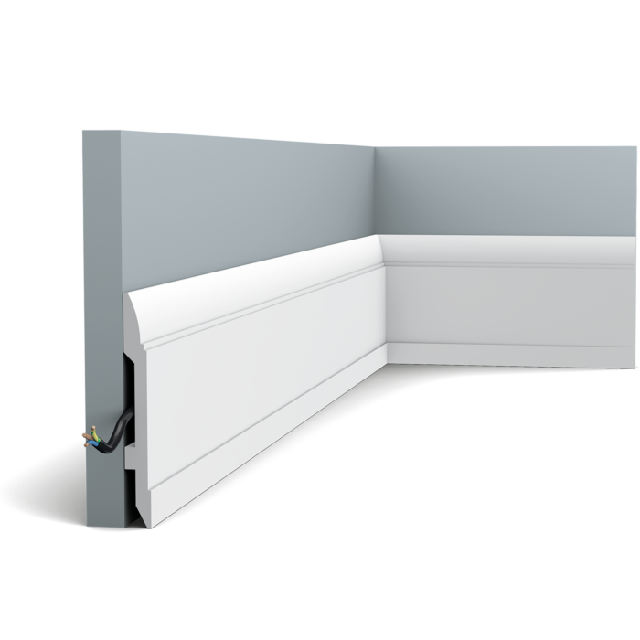 Плинтус ORAC Decor SX104 грунтован под покраску, что позволяет вам выбрать любой цвет и текстуру, которая подойдет вашему интерьеру.